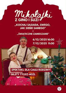 Z okazji mikołajek zapraszamy na wyjątkowe wydarzenie dla dzieci i całych rodzin! W grudniu zobaczycie nie tylko klasyczny spektakl „Gino i Suzi. Kochaj Sąsiada Swego jak Siebie Samego”, ale także wyjątkowy, grany tylko z tej okazji świąteczny dodatek – „Świąteczne Zamieszanie”, w którym Gino i Suzi powracają w zimowej odsłonie, pełnej gagów, muzyki i groteskowego uroku, z którego dobrze ich znamy!