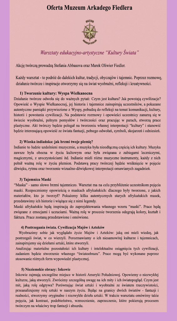 UWAGA!!! W SPRAWIE REZERWACJI WIZYTY DLA WYCIECZEK SZKOLNYCH UPRZEJMIE PROSIMY O REZERWACJĘ PRZEZ MAIL: fundacja-fiedlera@honestodds.com